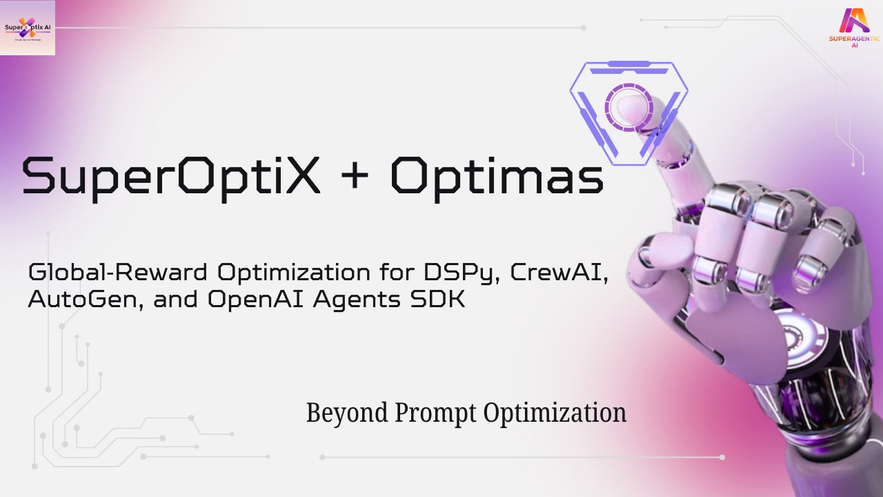 Optimization has been central to SuperOptiX from day one regardless it's prompt, weights, parameters or compute. It began with DSPy-style programmatic prompt engineering and teleprompting as it was the only framework doing prompt optimization. It was surprising that why other frameworks couldn't figure out the ways to optimise the prompts like DSPy but now we have solution. Today, we’re bringing Optimas into the SuperOptiX ecosystem so you can apply globally aligned local rewards across multiple frameworks: OpenAI Agent SDK, CrewAI, AutoGen, and DSPy. You can check out the Optimas and SuperOptiX integration here