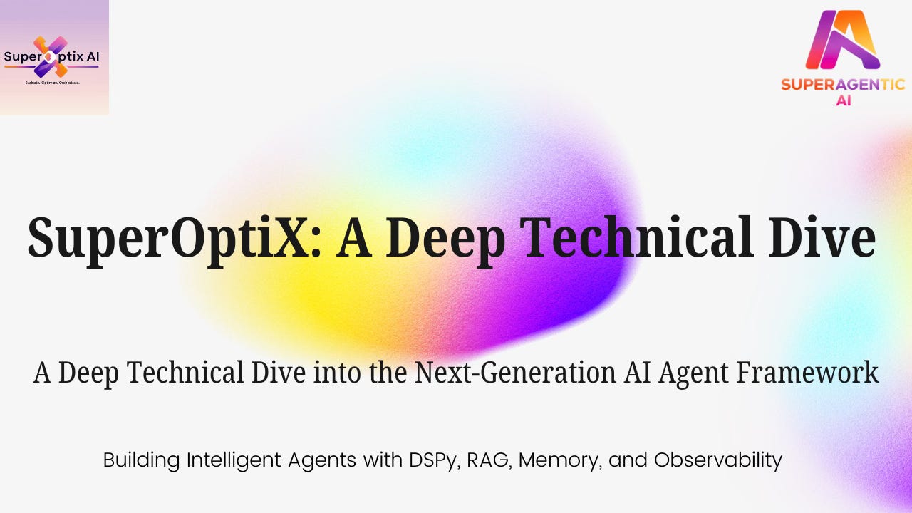 SuperOptiX represents a paradigm shift in AI agent development, combining the declarative power of DSPy with enterprise-grade features like RAG (Retrieval-Augmented Generation), multi-layered memory systems, comprehensive observability, and a sophisticated tool ecosystem. This deep technical dive explores how SuperOptiX leverages DSPy under the hood to create a powerful yet accessible framework for building production-ready AI agents.